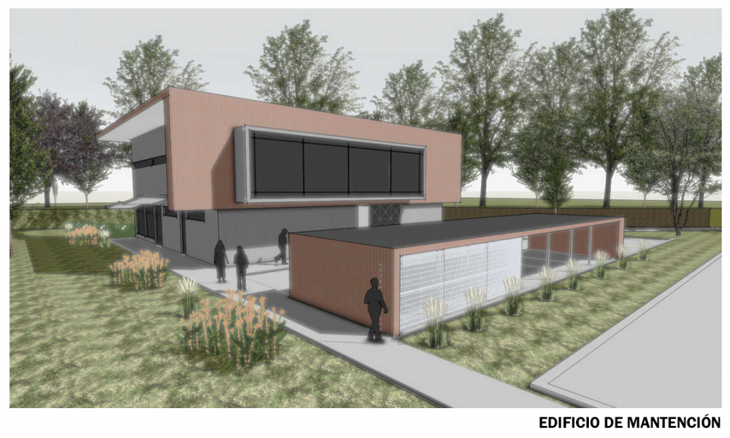 El Edificio Soporte, destinado a la mantención y operación del Parque Urbano, centralizará las unidades de seguridad, aseo y cuidado de áreas verdes.